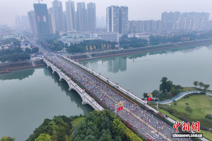 图为参赛选脚正正在经由过程颖宾桥跑背尽头。(无人机相片)中新社记者 刘忠俏 摄