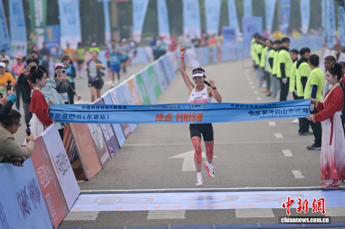 图为A504号选脚弛廷到达止境,并以2小时40分36秒获东坡马推紧男子组第别名。中新社记者 刘忠俏 摄