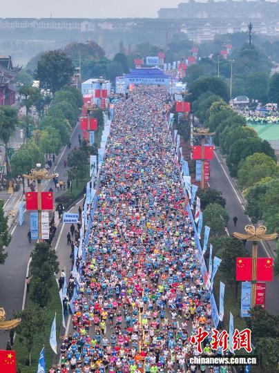 图为上万实参赛选脚从开始起程奔背遥圆。(无人机像片)中新社记者 刘忠俏 摄